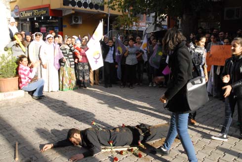 Kobane ve Şengal'deki savaştan kaçarak ilçeye sığınan sığınmacı kadınlar, ülkelerinde yaşanan trajediye ağladılar. Ergani Demokratik Özgür Kadın Hareketinin, kadına yönelik şiddete karşı mücadele günü etkinlikleri çerçevesinde DBP parti binası önünde sergilenen Kobane'deki savaşı konu alan sokak tiyatrosunu izleyen Kobane ve Şengalli kadın ve çocuklar hıçkıra hıçkıra ağladılar.
