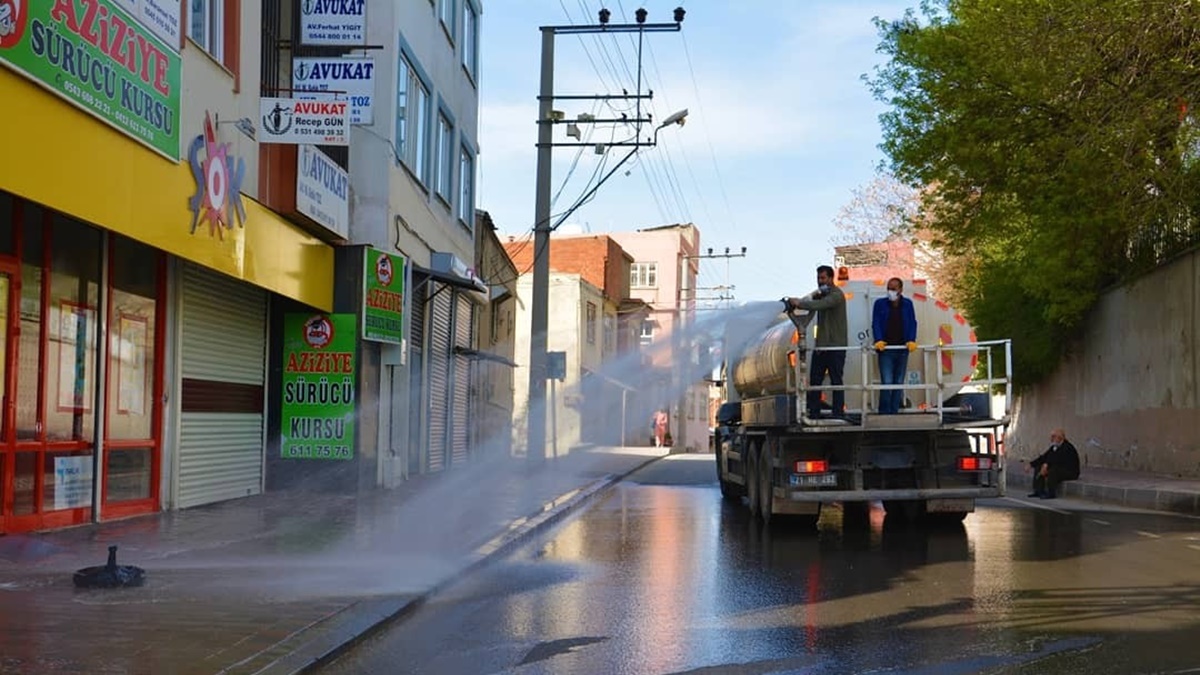 Çalışmalar kapsamında ekipler tarafından, ilçedeki yoğun cadde ve sokaklar tazyikli su ile yıkayarak dezenfekte edilirken, sokağa çıkma kısıtlamasını fırsat bilerek yol, kaldırım, hastane, ATM, durak, bank ve işyerlerinin giriş-çıkış noktalarında ayrıntılı dezenfekte çalışması yürütüldü.
